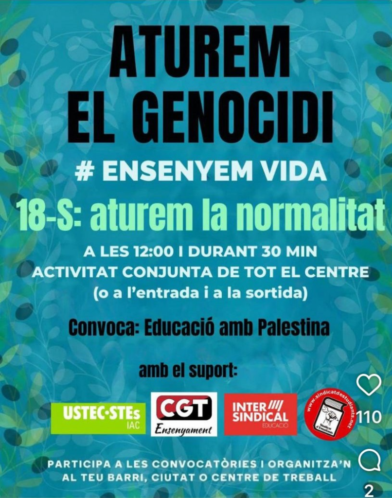 Últimament, hi ha hagut clars exemples d’intent de frenar dinàmiques socioeducatives de reflexió crítica com, per exemple i entre d’altres les interferències del Tribunal Superior de Justícia de Catalunya respecte a l’ús del català com a llengua vehicular de l’educació o la reacció del Departament d’Educació a conseqüència de la convocatòria del passat 18 de setembre feta sota l’eslògan “Aturem el Genocidi. Ensenyem Vida” on es demanava la implicació dels centres educatius per fer visible el que estava i està succeint en el genocidi de Gaza per part d’Israel. Una realitat d’injustícia i inhumanitat com tantes d’altres malauradament tan presents en el món, les quals, conseqüentment, haurien de ser tractades i visualitzades com a objectius formatius prioritaris i tractades sense cap tipus d’impediment i, al contrari, haurien d’estar totalment avalades i potenciades des de les institucions.