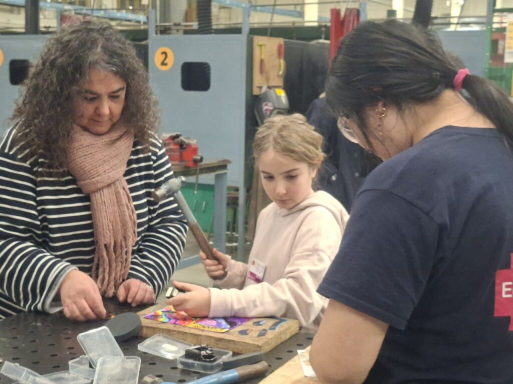 Un martell, una màquina plegadora de xapa o una pistola de silicona a les mans, una màscara protectora i un marc de fotos de metall que comença a agafar forma. Per a moltes nenes, fer un breu taller pràctic d’una hora de fabricació mecànica suposa la primera vegada que entren en un taller industrial. No és un joc: és una “Real Experience”, una proposta educativa pensada perquè nenes de primària i secundària entre 9 i 13 anys, acompanyades de les seves famílies, coneguin i experimentin en primera persona en què consisteixen alguns oficis del sector industrial i tècnic, tradicionalment masculinitzats, com la fabricació mecànica, la soldadura o la fusteria, i que es puguin imaginar a si mateixes ocupant aquestes professions en un futur.