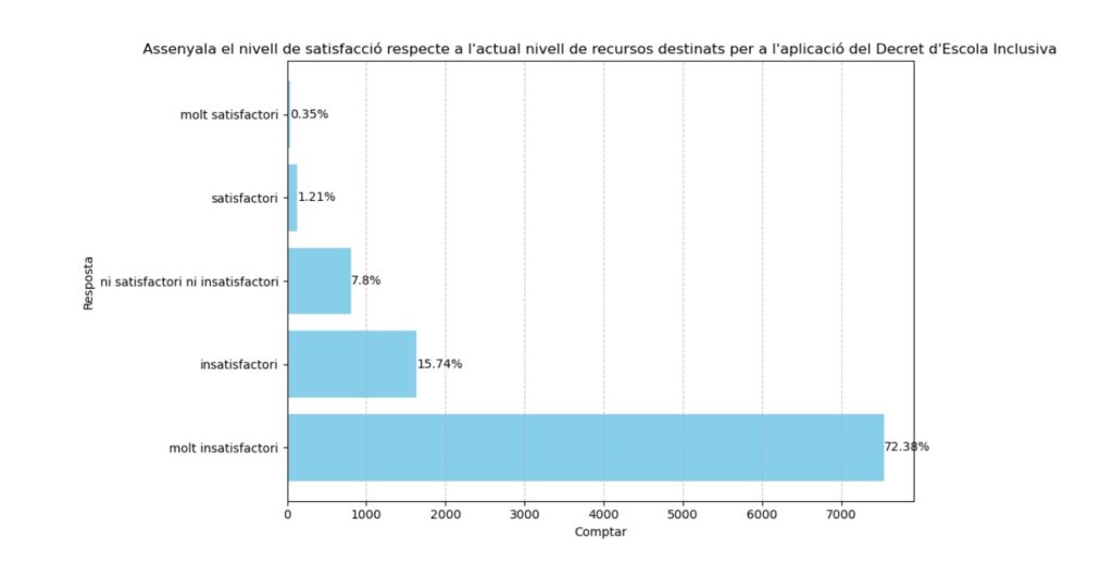 La manca de recursos en la inclusió és un dels aspectes en què hi ha més unanimitat, i és que poc més del 2% es mostra optimista amb l’aplicació del Decret de l’Escola Inclusiva del 2007, un decret que “anava acompanyat d’una memòria econòmica que mai s’ha desplegat”, incideix Segura.