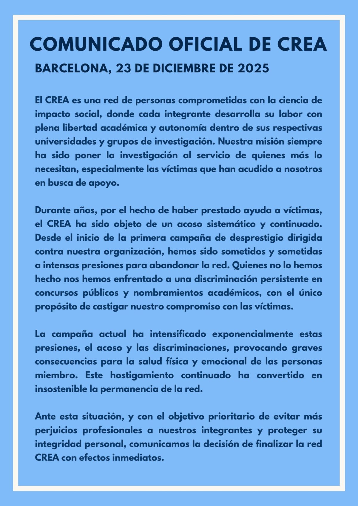 El mateix grup ha anunciat la seva dissolució, no sense abans, assegurar que s’ha arribat a aquest punt per la situació de salut física i mental que aquestes informacions han causat a les i els membres del CREA. «Davant d’aquesta situació, i amb l’objectiu prioritari d’evitar més perjudicis professionals als nostres integrants i protegir la seva integritat personal, comuniquem la decisió de finalitzar la xarxa CREA amb efectes immediats», asseguren en un comunicat.