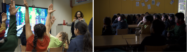 Com que l’escola és un dels espais més importants per al desenvolupament durant els primers anys de vida, juga un paper clau en aquesta tasca. Sovint, però, sorgeix la pregunta: com utilitzem les pantalles a l’aula d’una manera responsable i pedagògica en la primera infància? Una possible resposta seria usant-les com la gran pantalla de cinema, portant el cinema a l’escola (quan no és possible portar l’escola al cinema), transmutant les aules en petites sales cinematogràfiques, tal com succeeix en altres disciplines artístiques, com amb l’obra de dansa Cometa (2021) de Roser López Espinosa.