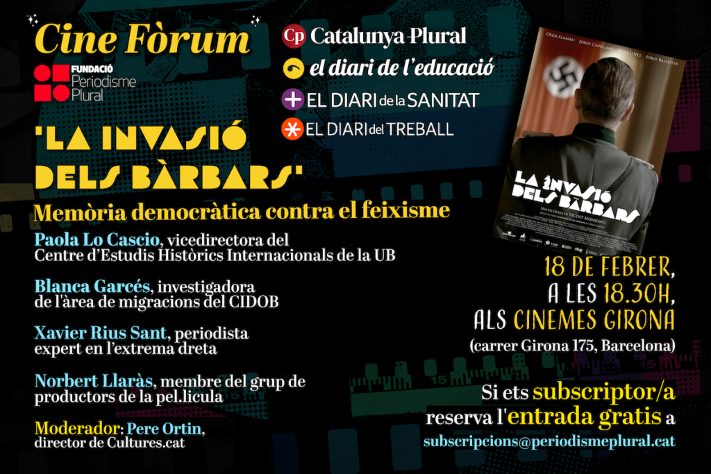 En el cinefòrum hi participaran Paola Lo Cascio, professora d’Història Contemporània i vicedirectora del Centre d’Estudis Històrics Internacionals de la UB. Blanca Garcés, investigadora del CIDOB, experta en migracions. Xavier Rius Sant, periodista expert en l’extrema dreta i Norbert Llaràs, membre de l’equip de productors de la pel·lícula. El periodista Pere Ortín, director de Cultures.cat, presentarà i moderarà el debat.
