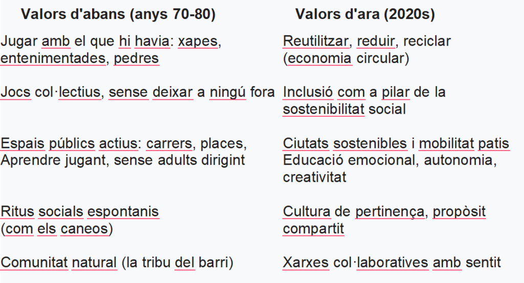 Els temps canvien, sí. Però si mirem amb cura, veurem que els valors fonamentals —cooperació, comunitat, creativitat, respecte pels recursos— segueixen aquí, encara que amb formes diferents. Aquí una comparació simbòlica: